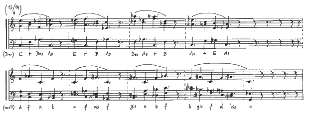 beide Stimmen basieren auf einer Reihe von zunächst 54 Tönen. Bei jedem
