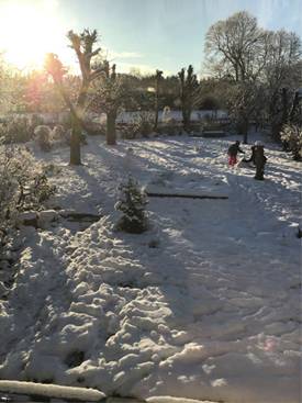 Die gestrige Nacht brachte hier immerhin soviel Schnee, daß wir heute nur zu Fuß (nicht auf Rädern) unterwegs an der frischen Luft waren.