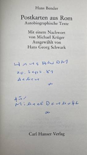 ... so war das aber nicht gemeint, lieber Theo Breuer! - daß Sie mir das Buch schicken - Ich wollte morgenfrüh in meine Buchhandlung gehen, um es zu bestellen! Hans Bender lernte ich in meinem Villa-Massimo-Stipendiums-Jahr in Rom 1987 kennen, als er dort für zwei Monate Ehrengast war. Und daraus ergab sich in Folge ein bis zuletzt sich verdichtender Austausch. Aber er korrespondierte ja ohnehin mit so vielen, hatte dabei aber - wie ich finde - stets ein untrügerisches Gespür für besondere Qualitäten. Für mich ist er in seiner so großzügigen und völlig uneitlen Art unter den Schriftstellern einem Günter Bialas bei den Komponisten vergleichbar, der nach dem 2. Weltkrieg wohl der wichtigste Kompositionslehrer war und ebenso uneitel und stets auch im Stillen seine jungen Kollegen förderte. Ich hatte das große Glück, Günter Bialas schon mit 13 Jahren kennenzulernen und es wurde bis zu seinem Tod 1995 eine besonders enge Freundschaft, wie ich sie unter Kollegen fast nur noch mit György Kurtág (dies bis heute, seit 1988!) fand. Und auch wenn ich manchmal ein wenig hadere mit der allgemeineren öffentlichen Wahrnehmung, so ist doch diese besondere gegenseitige Wertschätzung von verehrten Kollegen & Freunden viel wichtiger als alle gelegentlichen "Streicheleinheiten" von der Presse oder blasierten Kritikern.