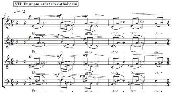 V. Et in unum Dominum Der Glaube an den Gottessohn Jesus Christus wird klanglich von unten nach oben aufgebaut. Was zuerst in rhythmischer Verschränkung erklingt, geht später akkordisch-homophon weiter, dann erneut verschoben, ehe „omnia facta sunt“ fast beklommen fragend endet.